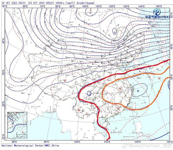 10月7日,副热带高压强得离谱,代表副热带高压的588线(图中红线)北界在甘肃南部至山东中部一带,592线(图中橙线)更是截止了福建、浙江、上海、江苏、安徽、湖北、湖南、江西等地。