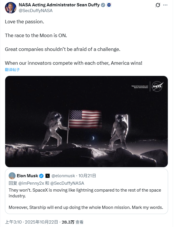 登月竞赛一经拉开帷幕。伟大的公司不应该细微挑战。当咱们的更正者相互竞争时,好意思国就赢了。